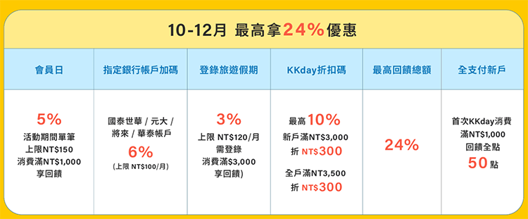 每一全支付帳戶,於KKday消費輸入登錄碼(10月份PXJK10 / 11月份PXJK11 / 12月份PXJK12)並使用全支付購買日本/韓國商品,單筆消費滿$1000享30全點回饋;滿$2000享60全點回饋;滿$3000享90全點回饋。