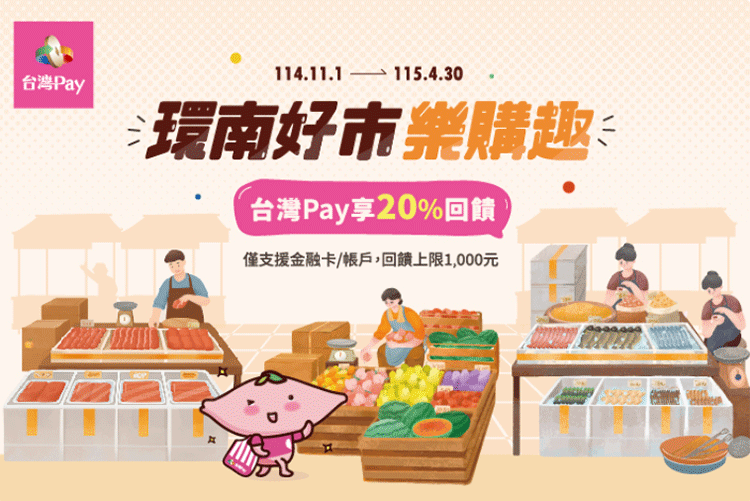 2025/11/01 - 2026/04/30至環南市場指定店家以「台灣Pay」QR Code掃碼(限金融卡/帳戶)進行支付,可享單筆交易不限金額20%現金回饋,活動期間每帳戶/金融卡回饋最高新臺幣1,000元為限。活動回饋總金額上限60萬元整,額滿為止,並公告於元大銀行官網。