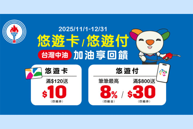 2025/11/01 ~ 2025/12/31至台灣中油直營加油站使用悠遊付付款享以下優惠: