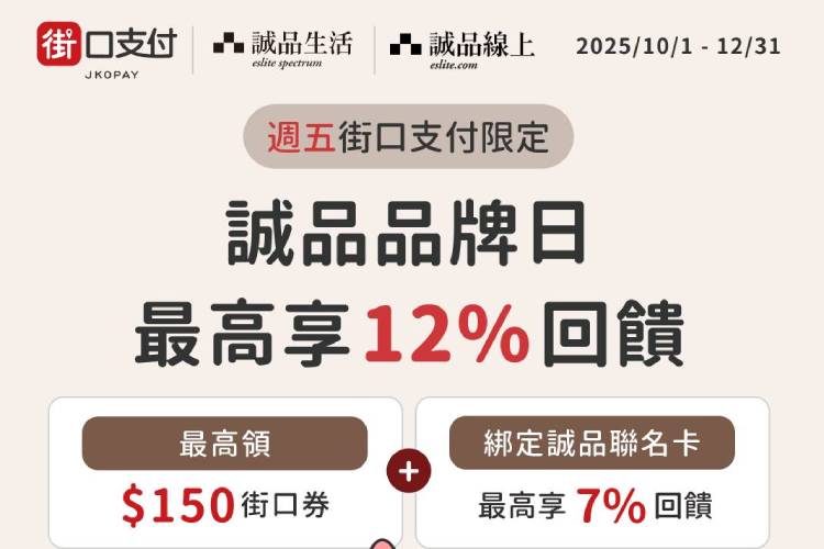 即日~2025/12/31 使用街口支付於誠品線上/誠品生活消費,享最高回饋12%。