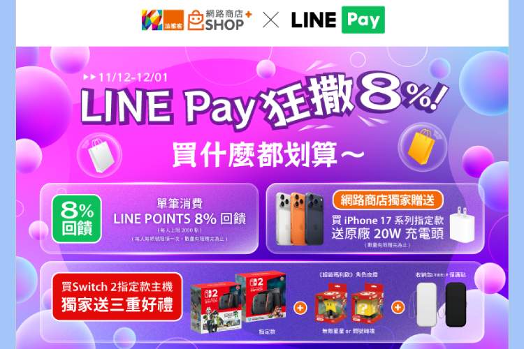 2025/11/12~2025/12/01,於法雅客e-shop消費,結帳時透過LINE Pay使用已綁定的任一發卡銀行信用卡/簽帳金融卡或iPASS MONEY帳戶付款,享LINE POINTS 8%回饋。