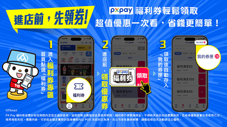 全聯積極推動線上線下整合,今(12/8)「PX Pay福利券」正式升級上線,全面養成會員「先領券、再消費」的使用習慣。此次升級最大亮點為「PX Pay福利券」首度整合全聯集團四大通路,涵蓋全聯、大全聯、小時達及全聯全電商,會員只要打開PX Pay,即可一次領取所有優惠。