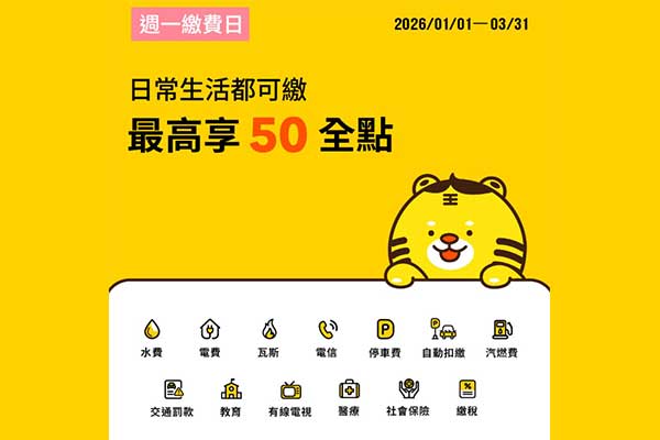 2026/1/1~2026/3/31每週一於全支付登錄活動並綁定帳戶付款,不限繳費金額,享生活繳費(含水電瓦斯|電信|學費|停車|稅金等)1%回饋(每月最高50全點)。