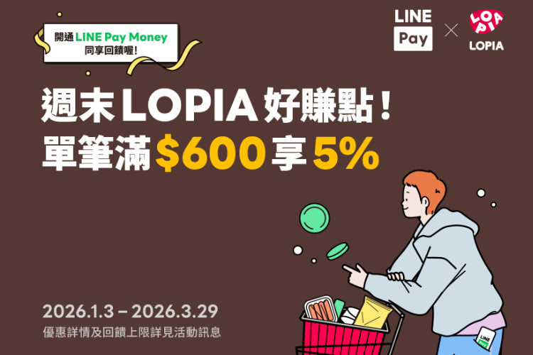 2026/01/03~2026/03/29,每週六日於LOPIA門市現場消費,結帳時透過LINE Pay條碼並使用已綁定的任一發卡銀行卡片或LINE Pay Money帳戶付款,且單筆交易實際支付滿新台幣600元,享LINE POINTS 5%回饋