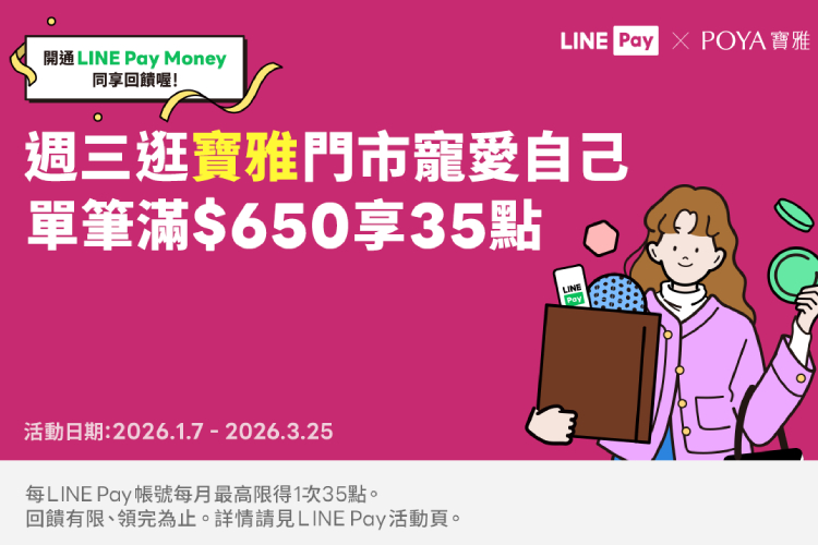 2026/01/07~2026/03/25,每週三於寶雅實體獨立門市現場消費,結帳時透過LINE Pay條碼並使用已綁定的任一發卡銀行卡片或LINE Pay Money帳戶付款,且單筆交易實際支付滿新台幣650元,享LINE POINTS 35點回饋。