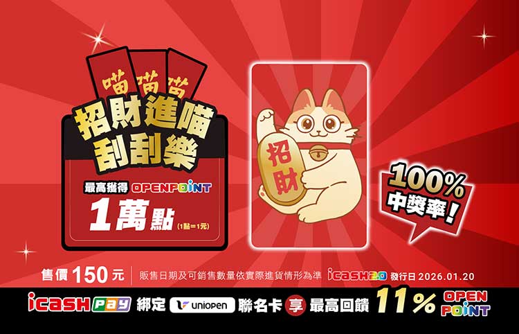 「2026 招財進喵刮刮樂 icash2.0」以喜氣滿滿的招財貓為主角,可愛的貓咪搭配滿滿金幣元素,象徵新的一年財氣進門、好運不斷,這次更特別將刮刮樂遊戲設計於卡片背面,每張卡片都能隨機刮出OPENPOINT點數,最高可獲得10,000點OPENPOINT(等值10,000元),100%的中獎率。