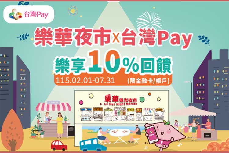 2026/02/01 - 2026/07/31至新北市「樂華夜市商圈」受理「台灣Pay」交易之指定店家,以「台灣Pay」QR Code掃碼支付(限金融卡/帳戶),單筆消費不限金額可享10%現金回饋,單筆消費回饋上限新台幣300元,活動回饋總金額上限30萬元,如達回饋金額上限,即停止回饋,並公告於上海商銀官網。