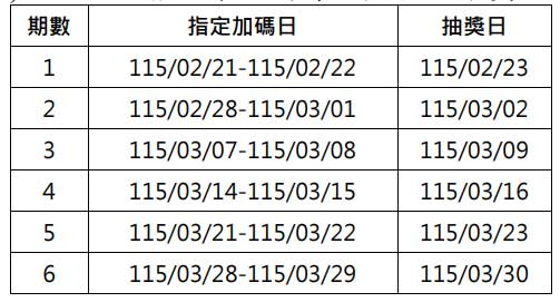 ※活動將於抽獎日,由電腦隨機自指定加碼日期間符合抽獎資格之交易紀錄中,抽出中獎者,並於抽獎日中午12:00前以「台灣行動支付」APP發送推播通知給中獎者,未中獎者不另行通知。
