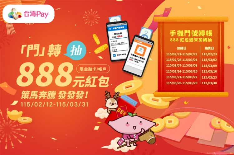 2026/02/12 - 2026/03/31使用「台灣行動支付」APP(限金融卡/帳戶),並註冊紅包服務(須同意紅包服務條款)享以下優惠: