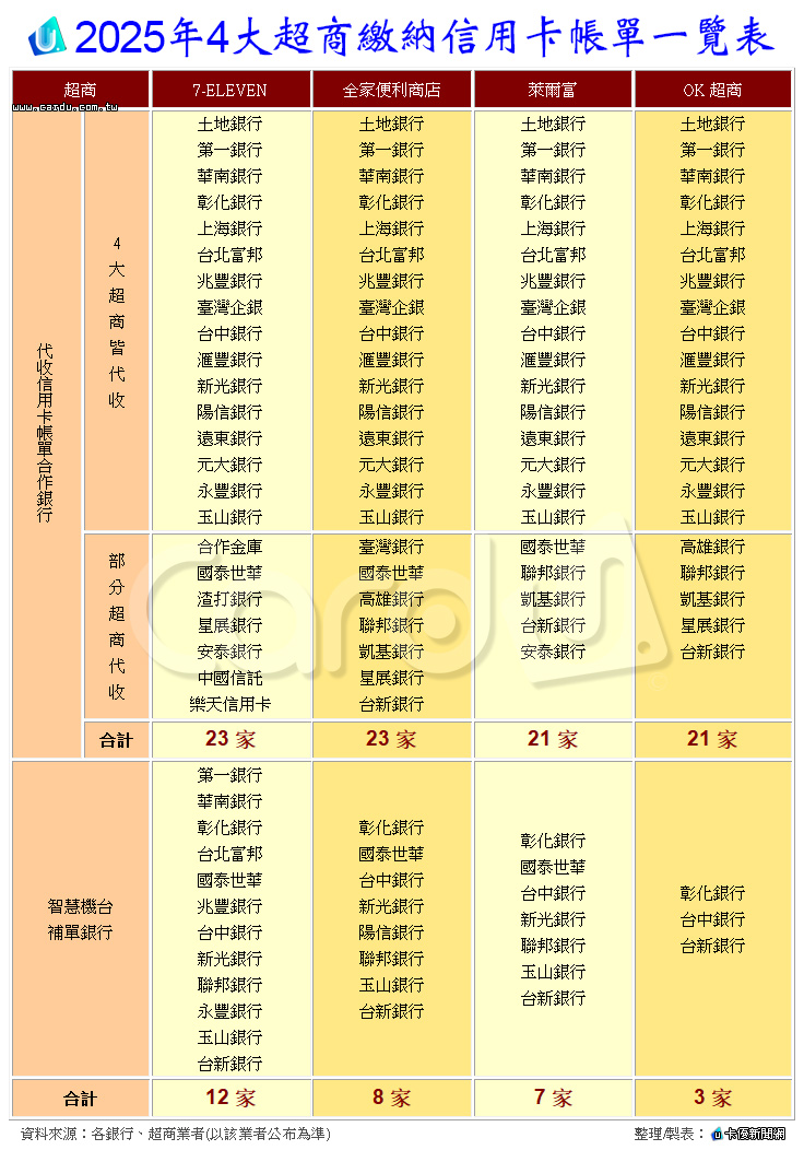 2025年4大超商繳納信用卡帳單一覽表,如下表:
