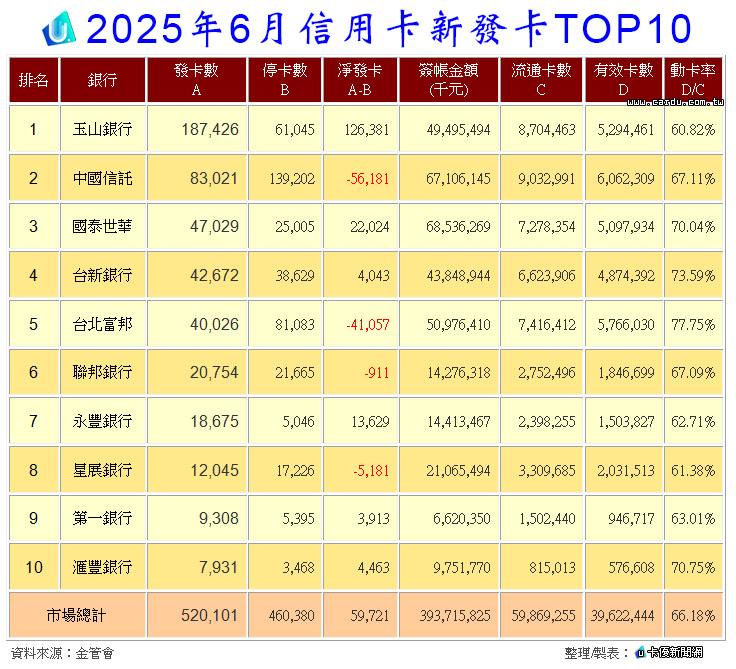 2025年6月信用卡新發卡TOP 10,如下表: