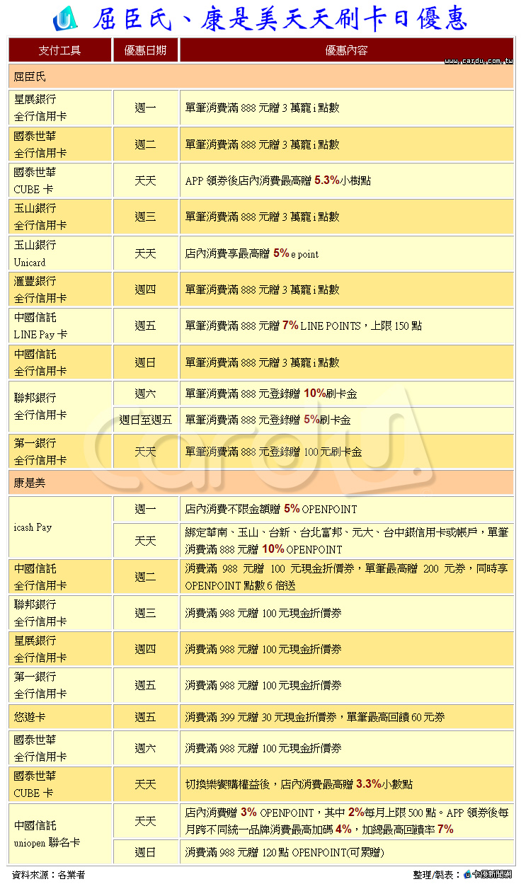 屈臣氏、康是美天天刷卡日優惠,如下表: