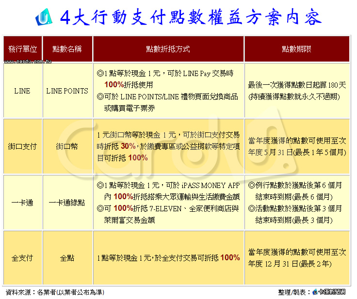 行動支付業者以「點數」圈粉,各家累點、折抵率及期限不盡相同!目前主要流通的點數方案有4種,其中「LINE POINTS」使用期限最長。「街口幣」一般消費最高可折30%消費,在APP繳費更能100%抵扣。「一卡通綠點」能100%折抵大眾運輸車資與生活帳單,近期開放能抵超商消費。「全點」也能100%折抵所有全支付交易,期限最長達2年。