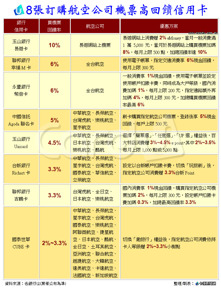 8張訂購航空公司機票高回饋信用卡,如下表: