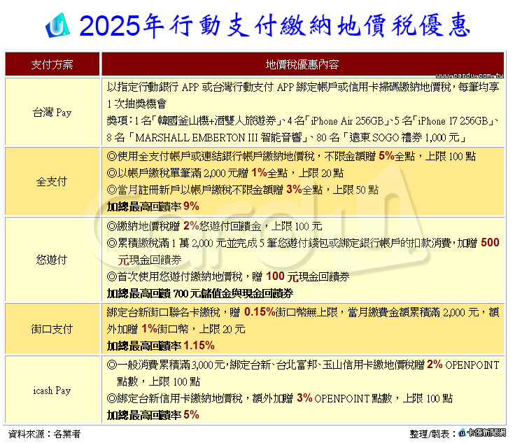 地價稅已經開徵,以「行動支付」繳納還能獲得專屬好康。台灣Pay釋出繳稅優惠,每繳1筆稅單都能抽獎,最大獎為韓國釜山雙人遊;全支付與街口支付力推點數回饋,疊加新戶優惠最高贈9%全點或1.15%街口幣。悠遊付送2%回饋金與600元現金回饋券;icash Pay綁定台新銀、北富銀、玉山銀信用卡繳稅,最高贈5% OPENPOINT點數。