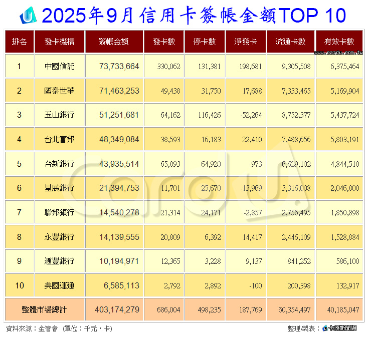 2025年9月信用卡簽帳金額TOP 10,如下表:
