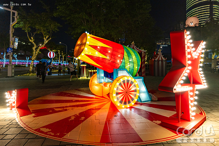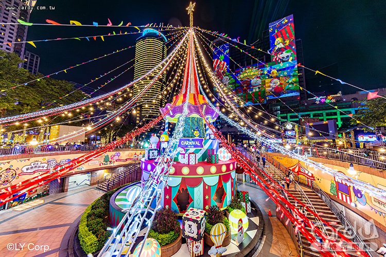 「2025新北歡樂耶誕城」以馬戲團為主題靈感,主燈「歡樂馬戲棚」結合市府北面牆燈光秀,配合動態機械裝置與音樂節奏,營造出宛如表演現場的歡騰氛圍,站前廣場的「魔幻時鐘塔」與「LINE FRIENDS歡樂摩天輪」更增添夢幻童趣。
