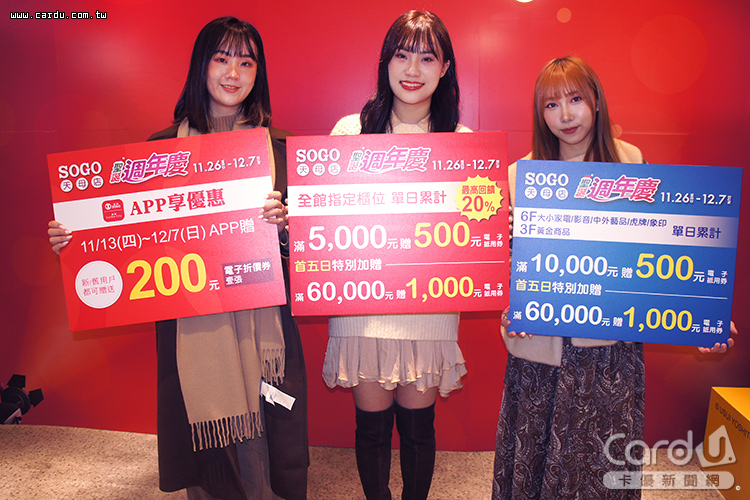 天母SOGO百貨週年慶在11月26日接棒,12月7日前化妝品全面9折起,秋冬服飾最低殺至6折,化妝品/珠寶/男女服飾單筆購滿5,000元送500元券,大小家電/藝品/黃金單筆購滿1萬元贈500元券,首5日消費滿6萬元再加碼1,000元券,疊加中國信託SOGO聯名卡的4%禮券,合計最高回饋率衝上20%。