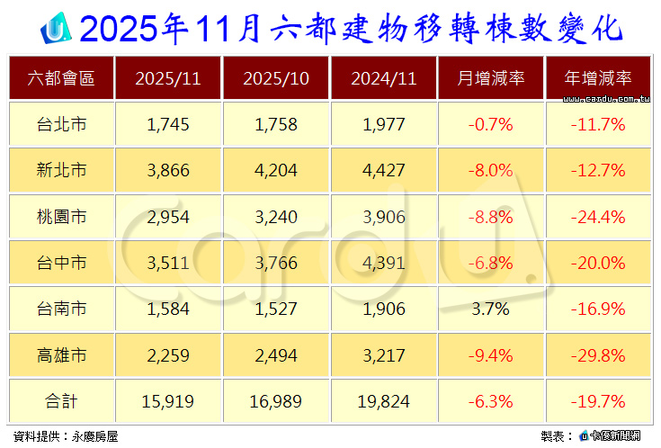 2025年11月六都建物移轉棟數變化,如下表: