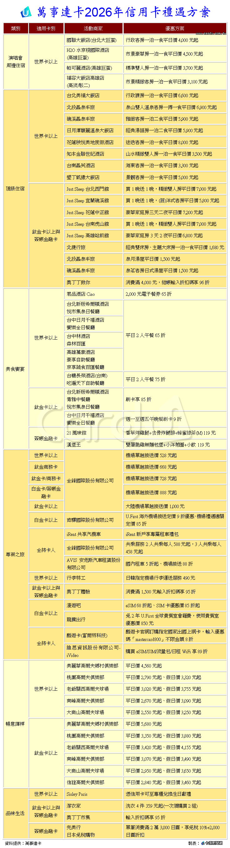 萬事達卡2026年信用卡禮遇方案,如下表: