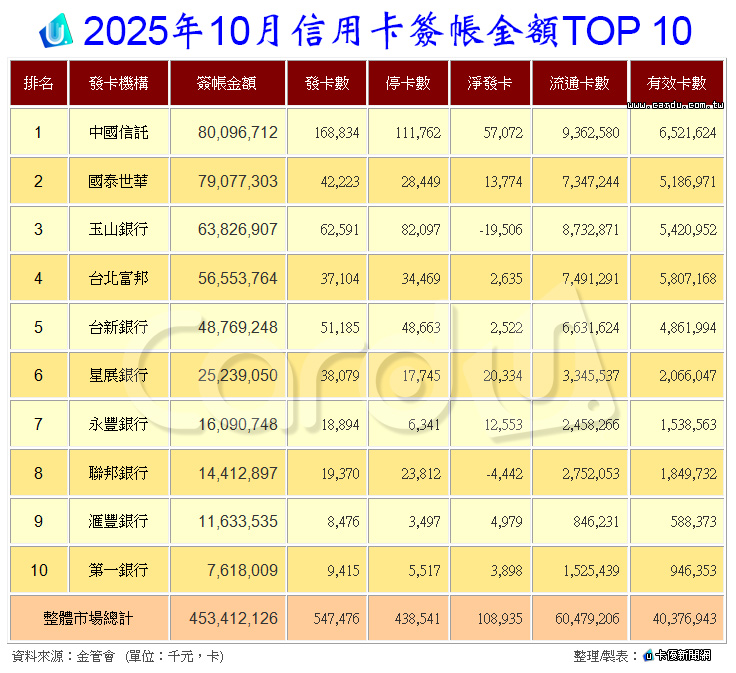 2025年10月信用卡簽帳金額TOP 10,如下表: