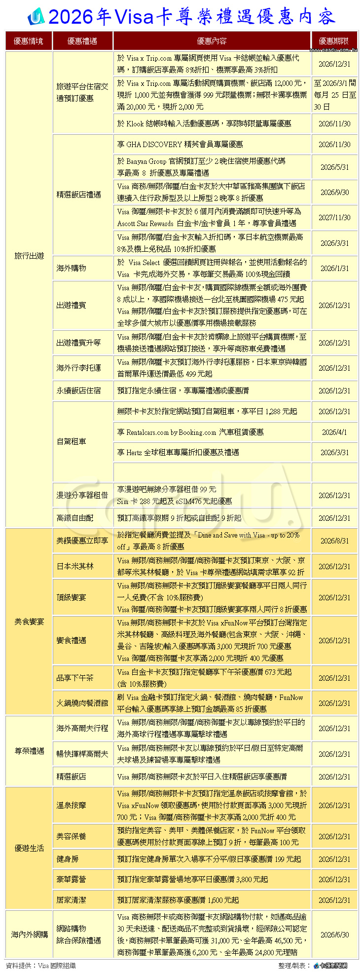 2026年Visa卡尊榮禮遇優惠內容,如下表:
