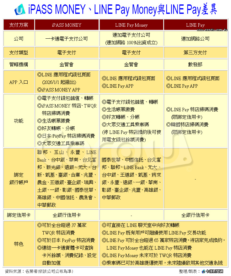 LINE Pay Money開通上線,iPASS MONEY與LINE Pay分手,搞得民眾很「阿雜」!《卡優新聞網》詳細解說3大行動支付的前世今生,「iPASS MONEY」就是原本可在LINE聊天室中轉帳、儲值的電子支付,但明(2026)年起被迫退出,由LINE Pay新服務LINE Pay Money取而代之,一般消費可使用LINE Pay第三方支付綁定信用卡交易。