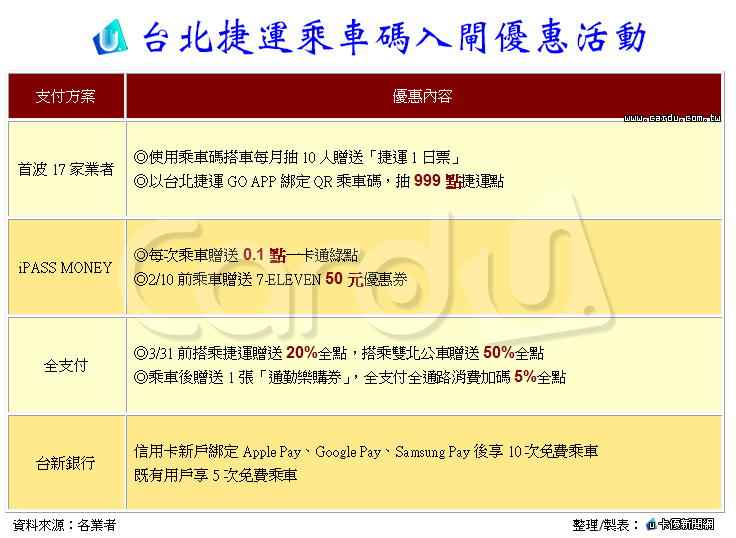 一卡通iPASS Money每次乘車即贈0.1點一卡通綠點,2月10日前還能獲贈50元7-ELEVEN優惠券。全支付3月底前掃碼搭捷運,不限金額皆可領到20%全點,每月最高拿80點;搭乘雙北公車賺50%全點,每月最高96點,乘車後還能得到1張「通勤樂購券」,在全通路消費加送5%全點。台新信用卡新戶使用3大國際行動支付感應乘車享10次免費好康,既有用戶給5次免費福利。