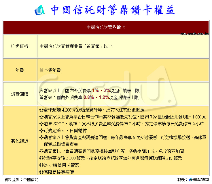 中國信託財管鼎鑽卡權益內容,如下表: