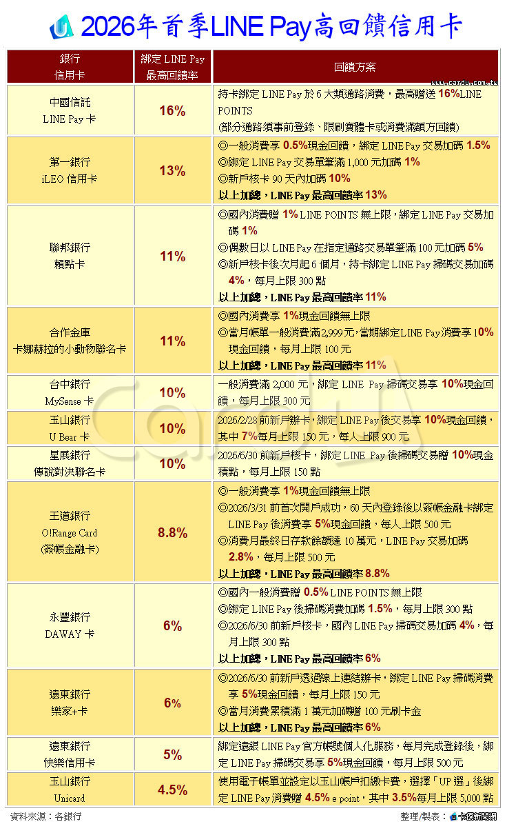 2026年首季綁定LINE Pay高回饋信用卡,如下表: