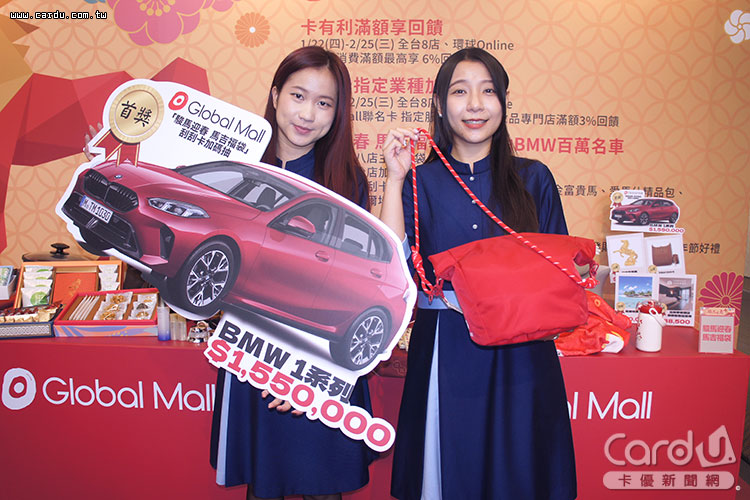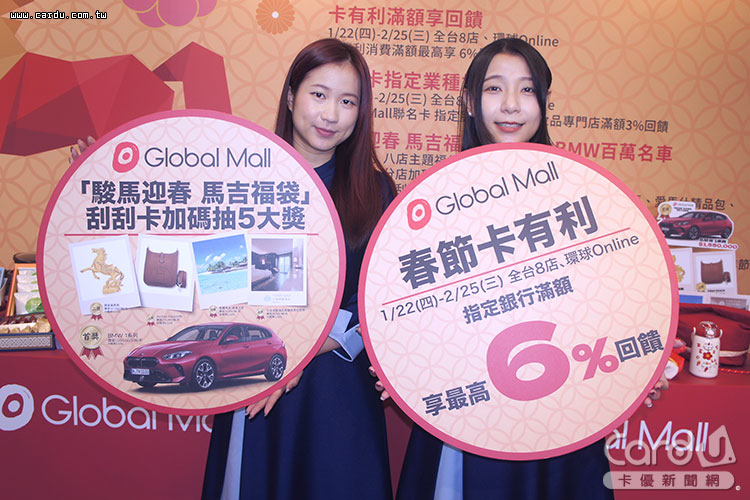 Global Mall環球購物中心自1月22日至2月25日進入「駿馬迎春」春節大檔,全台8店與環球Online同步推出「新春卡有利最高9%回饋」方案,使用指定銀行信用卡消費滿1萬元、2萬元贈5%、6%會員點數,刷中國信託Global Mall聯名卡選購服飾、化妝品單筆滿2,000元,再送1%刷卡金與2%點數,加總最高回饋率達9%,首次綁定GMPay再拿100元電子商品禮券。