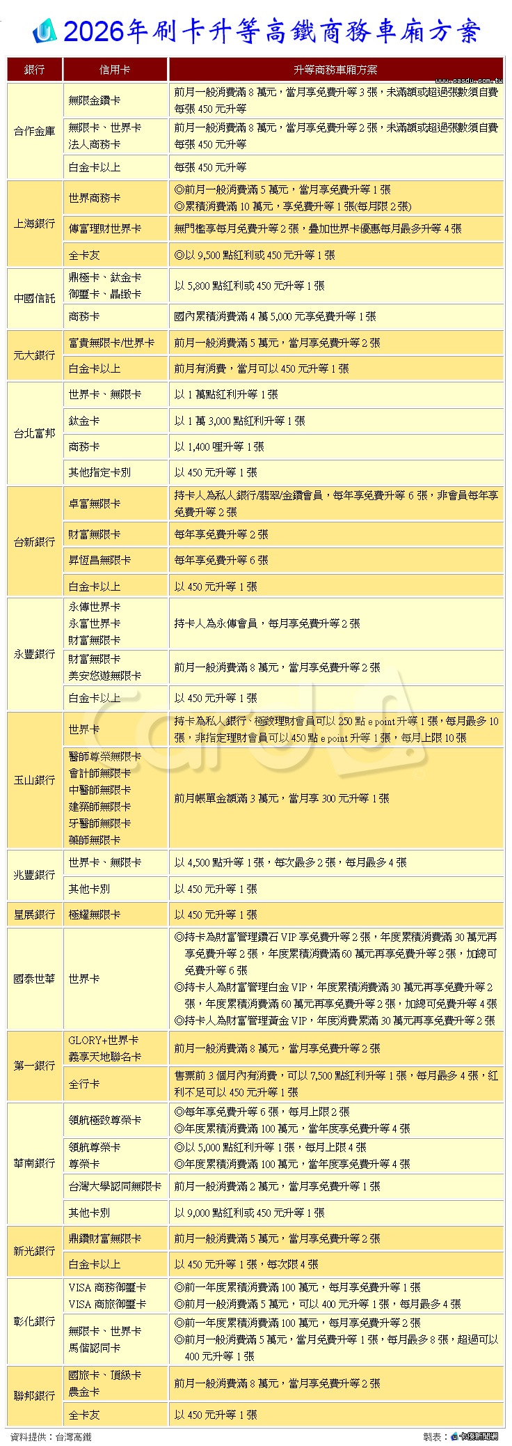 2026年信用卡升等高鐵商務車廂方案,如下表: