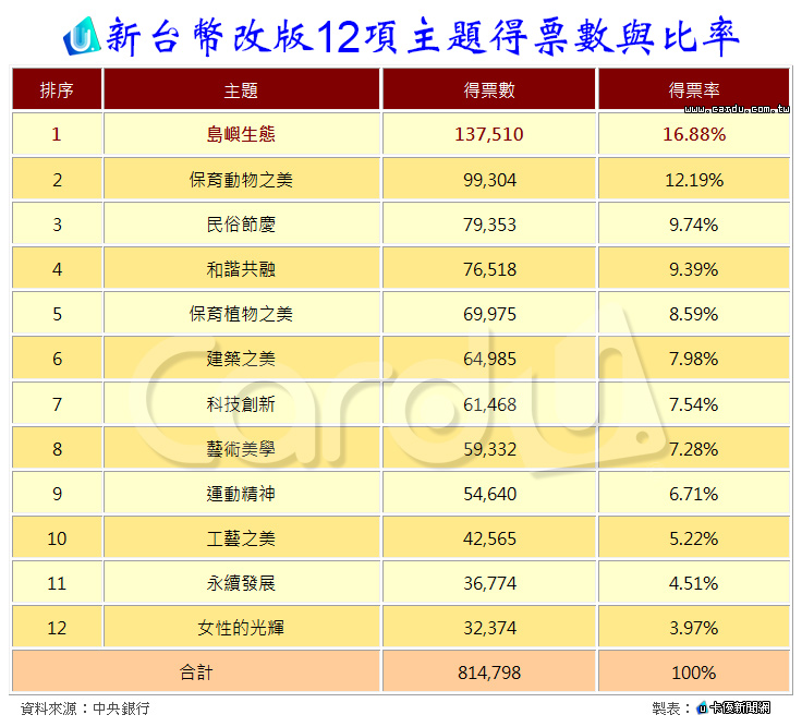 新台幣改版12項主題得票數與比率,如下表: