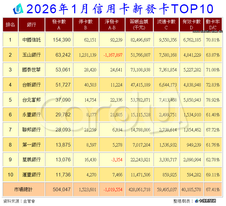 2026年1月信用卡新發卡TOP 10,如下表: