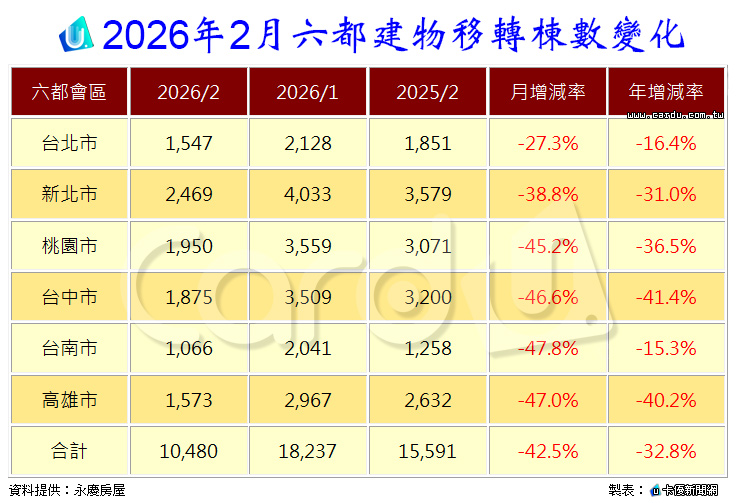 根據統計,2月六都房屋移轉總量僅1萬480棟,月墜42.5%,為有紀錄以來單月次低,僅高於2016年2月的7,406棟。各大都會區衰退幅度明顯,桃園市、台中市、台南市、高雄市降幅都超過45%,台北市與新北市月跌27.3%與38.8%。與去年同期相比,台中市驟減41.4%最多,其次為高雄市負40.2%與桃園市負36.5%。