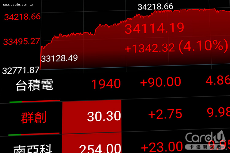台北股市翻紅,股民一吐前幾日狂跌的怨氣。在電子權值股領軍下,台股今(11)天強勢反彈,加權指數終場大漲1,342.32點,收在34,114.19點,寫下史上第2大收盤漲點紀錄,並重新站回34,000點整數關卡,單日漲幅約4.1%,成交值達6,720.21億元。市場買盤集中在半導體與電子族群,帶動指數開高走高。